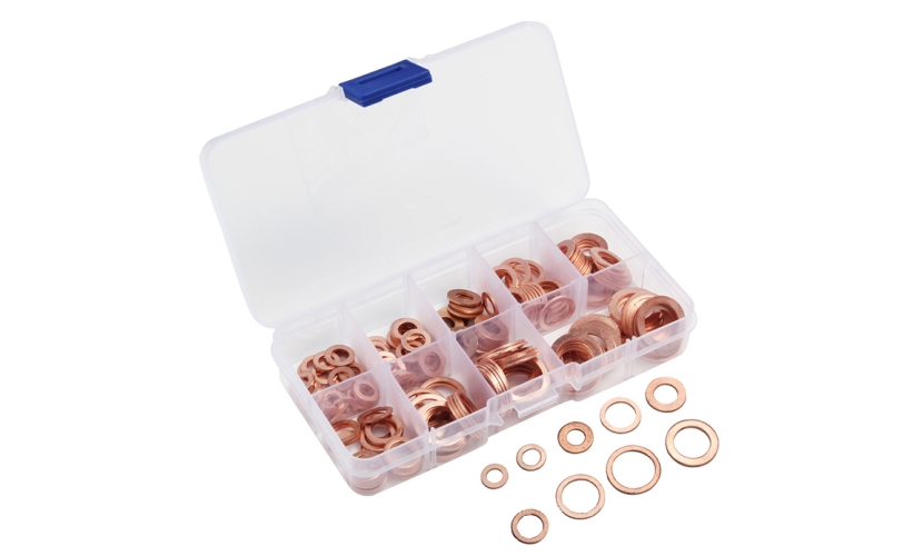 Περιεχόμενα σετ:30x χάλκινες ροδέλες, M5x9x1mm30x χάλκινες ροδέλες, M6x10x1mm20x χάλκινες ροδέλες, M6x12x1mm20x χάλκινες ροδέλες, M8x12x1mm20x χάλκινες ροδέλες, M8x14x1mm20x χάλκινες ροδέλες, M10x14x1mm20x χάλκινες ροδέλες, M12x16x1mm20x χάλκινες ροδέλες, M14x18x1mm20x χάλκινες ροδέλες, M12x18x1.5mm