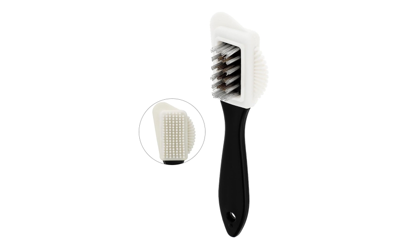 Βούρτσα καθαρισμού δύο όψεων, ιδανική για τον καθαρισμό και συντήρηση δερμάτινων παπουτσιών τύπου suede και nubuck.Διαθέτει δύο κεφάλες καθαρισμού, μια με τρίχες από νάιλον και μια με συρμάτινες τρίχες, κατάλληλες για διαφορετική εφαρμογή.Η μακριά πλαστική λαβή εξασφαλίζει σταθερό κράτημα και άνεση κατά τον καθαρισμό.
