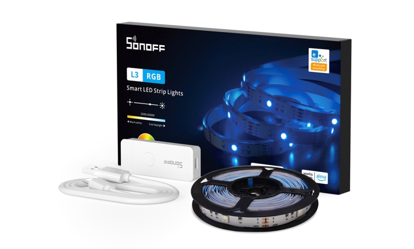 LED καλωδιοταινία L3 της Sonoff με RGB φωτισμό και μήκος 5 μέτρα. Ο έλεγχος της γίνεται απομακρυσμένα από smartphone μέσω Wi-Fi και της εφαρμογής eWeLink. Επιπλέον, υποστηρίζει φωνητικό έλεγχο με Amazon Alexa & Google Assistant.Στην συσκευασία συμπεριλαμβάνεται χειριστήριο και καλώδιο τροφοδοσίας USB.