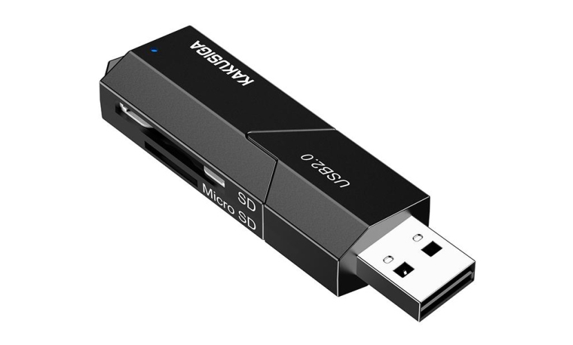 Card reader της KAKUSIGA, σε μέγεθος USB flash, με 2 υποδοχές στις οποίες μπορείτε να τοποθετήσετε μια SD και μια micro SD κάρτα μνήμης.Συνδέεται στον επιτραπέζιο ή φορητό υπολογιστή σας μέσω θύρας USB.