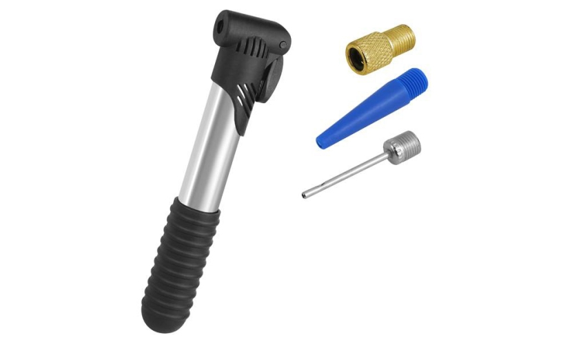 Μίνι τρόμπα χειρός με 3 ακροφύσια για το φούσκωμα των ελαστικών του ποδηλάτου σας. Το σώμα της είναι κατασκευασμένο από αλουμίνιο και ανθεκτικό πλαστικό υλικό. Στη συσκευασία συμπεριλαμβάνονται βάση και βίδες για την τοποθέτηση της στο ποδήλατο.