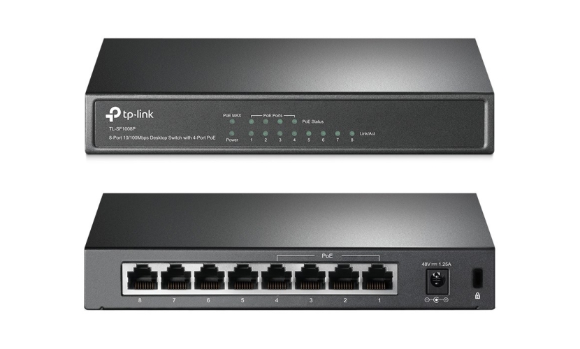 TL-SF1008P is an 8 10/100Mbps ports unmanaged switch that requires no configuration and provides 4 PoE (Power over Ethernet) ports. It can automatically detect and supply power with all IEEE 802.3af compliant Powered Devices (PDs). In this situation, the electrical power is transmitted along with data in one single cable allowing you to expand your network to where there are no power lines or outlets, where you wish to fix devices such as APs, IP Cameras or IP Phones, etc.