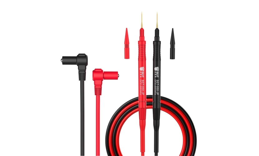 Σετ ακροδέκτες πολυμέτρου με γωνιακά φις μπανάνα, και αφαιρούμενη μύτη. Διαθέτει εύκαμπτο καλώδιο σιλικόνης και προστατευτικά καπάκια.Συμβατό με τα περισσότερα πολύμετρα της αγοράς.