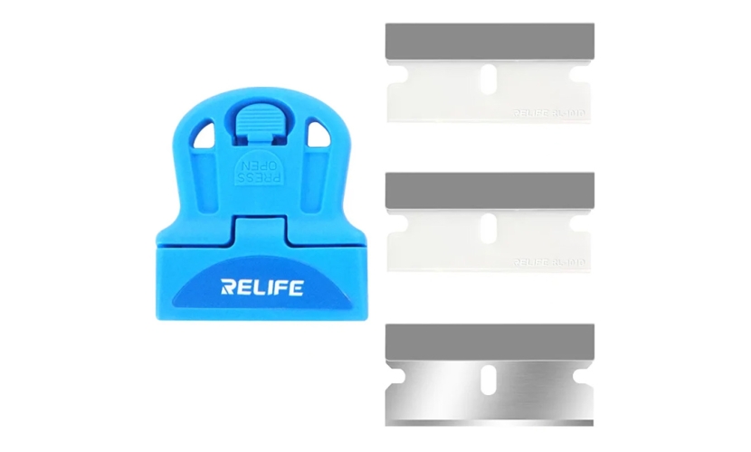 Εργαλείο της Relife, κατάλληλο για κοπή και αφαίρεση κόλλας σε εργασίες διαχωρισμού της οθόνης από smartphone.Εξοπλίζεται με 1 μεταλλική λεπίδα και 2 κεραμικές λεπίδες που παρέχουν εξαιρετική μόνωση σε υψηλές θερμοκρασίες.
