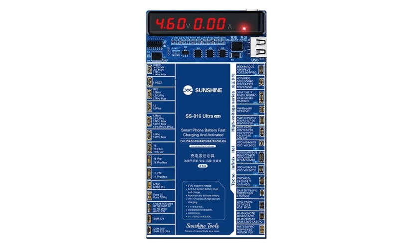 Πλακέτα για φόρτιση, εκκίνηση και έλεγχο τάσης μπαταριών για συσκευές Apple και Android.Για επαγγελματίες και όχι μόνο, που ειδικεύονται στις επισκευές smartphone, η Sunshine προσφέρει μεγάλη ποικιλία ποιοτικών εργαλείων που μπορεί να καλύψει μεγάλο εύρος εργασιών.