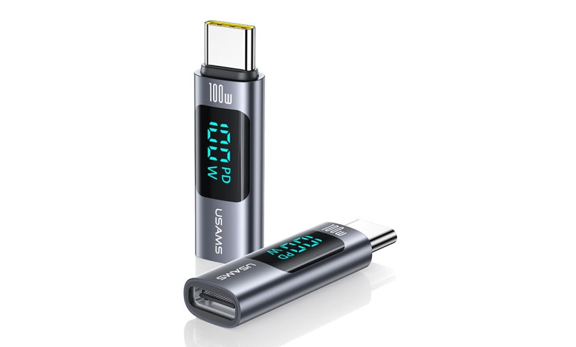 Aντάπτορας USB-C σε USB-C της Usams με οθόνη προβολής της απόδοσης φόρτισης σε πραγματικό χρόνο. Υποστηρίζει φόρτιση με απόδοση έως 100W.