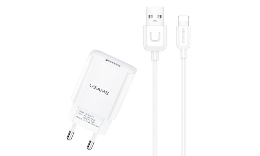 Υψηλής απόδοσης USB φορτιστής τοίχου της Usams, κατασκευασμένος από ανθεκτικό υλικό και συμβατός με όλες τις συσκευές που φορτίζουν μέσω USB θύρας.Διαθέτει 1 θύρα εξόδου USB που υποστηρίζει φόρτιση με απόδοση έως 2.1A.Στη συσκευασία συμπεριλαμβάνεται καλώδιο φόρτισης και μεταφοράς δεδομένων, Lightning σε USB, μήκους 1 μέτρου.