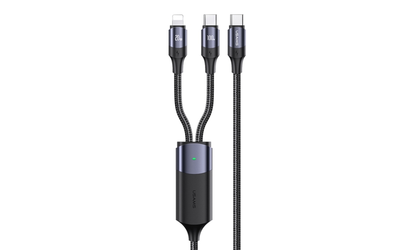 Καλώδιο φόρτισης και μεταφοράς δεδομένων USB-C σε USB-C και Lightning της Usams, με απόδοση φόρτισης έως 100W.Είναι κατασκευασμένο από υψηλής ποιότητας υλικά, με κομψό design και συνοδεύεται από δεματικό αυτοκόλλητο τύπου velcro για εύκολη αποθήκευση.