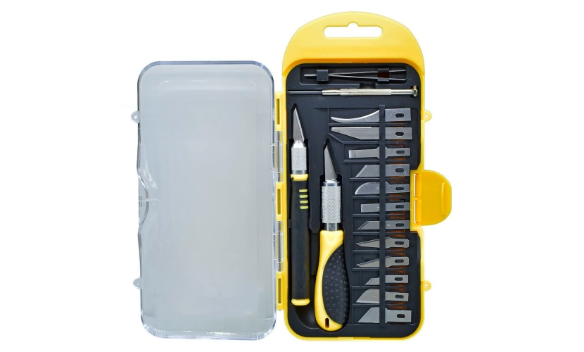 Περιεχόμενα σετ-2x κοπίδια (με λεπίδες)-12x λεπίδες-τσιμπίδα-κατσαβίδι ίσιο-πλαστική θήκη