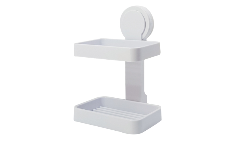 Βάση μπάνιου της Ecoco με 2 θέσεις για σαπούνι, σε λευκό χρώμα. Τοποθετείται εύκολα στον τοίχο με αυτοκόλλητο το οποίο αποσπάται από την βάση, διευκολύνοντας τον καθαρισμό της.
