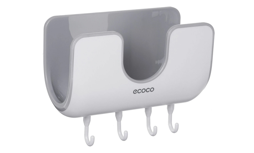 Βάση τοίχου για κουζίνα της Ecoco με 4 γάντζους και κομψό σχεδιασμό. Προσφέρει χώρους αποθήκευσης για τιγανια ή καπακια κατσαρολας αλλα και διαφορων αλλων σκευων μαγειρικης που μπορουν να κρεμαστουν απο τους γάντζους. Τοποθετείται εύκολα σε οποιαδήποτε επίπεδη επιφάνεια με αυτοκόλλητα κλιπ τα οποία αποσπώνται από την βάση, διευκολύνοντας τον καθαρισμό της.