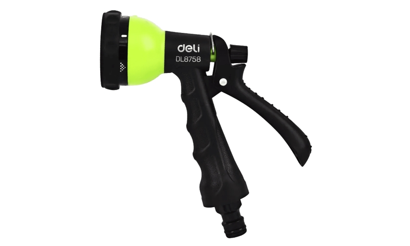 Πιστόλι εκτόξευσης νερού της Deli με 7 λειτουργίες ψεκασμού. Διαθέτει αντιολισθητική λαβή που εφαρμόζει καλά στο χέρι για πιο ξεκούραστο πότισμα.