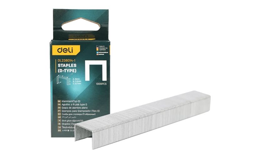 Συνδετήρες σχήματος Π της Deli, κατάλληλοι για χρήση με καρφωτικό εργαλείο χειρός. Η συσκευασία περιλαμβάνει 1000 συνδετήρες.
