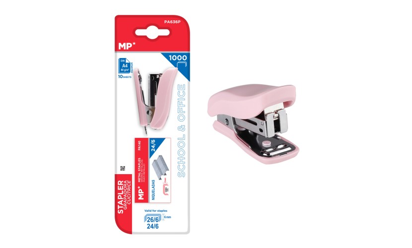 Mini συρραπτικό της MP, πρακτικό και εύχρηστο για το σχολείο, το γραφείο ή το σπίτι. Είναι συμβατό με ανταλλακτικά 24/6 και 26/6, ενώ στη συσκευασία συμπεριλαμβάνεται πακέτο ανταλλακτικών συρραπτικού 24/6 (1000 τεμάχια).