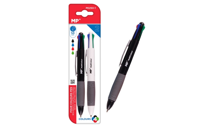 Στυλό διαρκείας της MP με μηχανισμό προώθησης και ανάκλησης, με 4 διαφορετικά χρώματα και μύτη πάχους 1mm.Διαθέτει λαστιχένια λαβή, για άνετο και ξεκούραστο κράτημα και καπάκι με κλικ για να ασφαλίζει στις τσέπες των ρούχων και στα τετράδια.