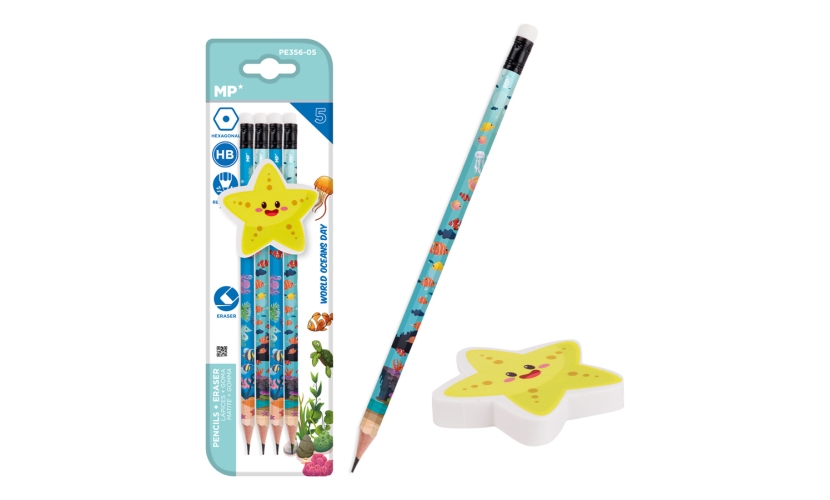 MP σετ ξύλινα μολύβια & γόμα World oceans day PPE356-05, εξάγωνα, HB, 5τμχ