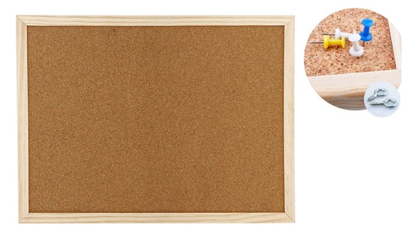 Πίνακας ανακοινώσεων από φελλό, διαστάσεων 30 x 40cmΣτη συσκευασία συμπεριλαμβάνονται ειδικές βίδες για το κρέμασμα του πίνακα στον τοίχο και 5 χρωματιστές πινέζες.