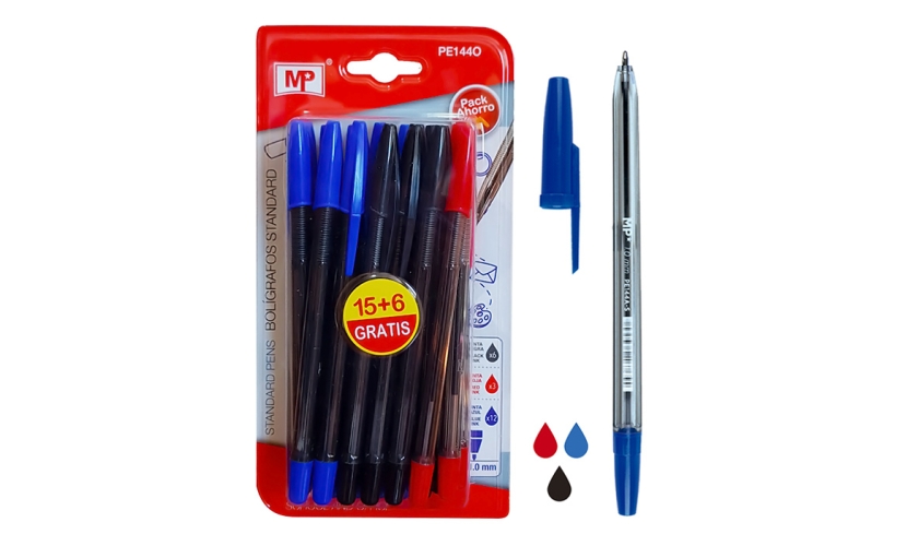 Στυλό διαρκείας της MP με μύτη πάχους 1mm και διάφανο στέλεχος για να βλέπετε την ποσότητα του μελανιού που απομένει. Δαθέτει καπάκι με κλικ για να ασφαλίζει στις τσέπες των ρούχων και στα τετράδια.Το σετ συμπεριλαμβάνει 21 τεμάχια, σε τρία διαφορετικά χρώματα: μπλε, μαύρο και κόκκινο.