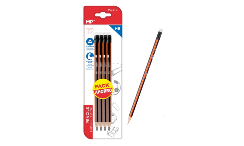 MP ξύλινο μολύβι με γόμα PE301-3, τρίγωνο, HB, 12τμχ