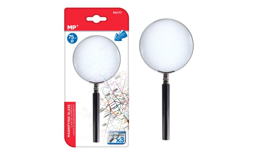 Μεγεθυντικός φακός χειρός της MP ιδανικός για ανάγνωση μικρών γραμμάτων, παρατήρηση αντικειμένων και λεπτομερή εργασία.Έχει διάμετρο 75mm και μπορεί να μεγενθύνει τα αντικείμενα έως και 3 φορές.