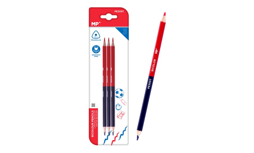 MP ξυλομπογιά με διπλή μύτη PE305T, 3mm μύτη, τρίγωνο, μπλε/κόκκινο, 3τμχ