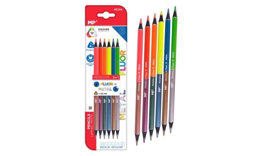 Σετ χρωματιστών ξυλομπογιών με διπλή μύτη της MP σε 12 αποχρώσεις φθορίζοντος και μεταλλικού χρώματος.Η συσκευασία περιλαμβάνει 6x ξυλομπογιές με διπλή μύτη.