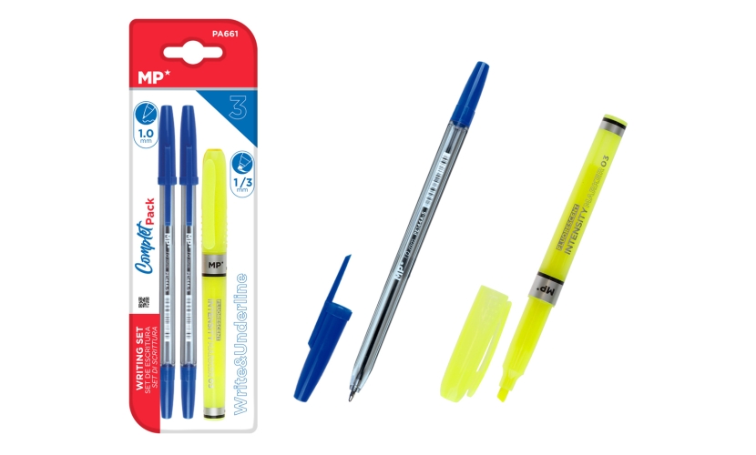 Σετ της MP που αποτελείται από 2 ballpoint στυλό μπλε χρώματος και 1 μαρκαδόρος υπογράμμισης κίτρινου χρώματος.