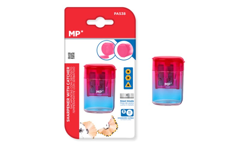 Ξύστρα μολυβιών της MP με μεταλλική λεπίδα και ενσωματωμένο κάδο απορριμμάτων για καθαρό και εύκολο ξύσιμο χωρίς υπολείμματα. Διαθέτει διάφανο χρωματιστό σώμα με καπάκι και είναι συμβατή με τους περισσότερους τύπους στρογγυλών, εξάγωνων και τρίγωνων μολυβιών.
