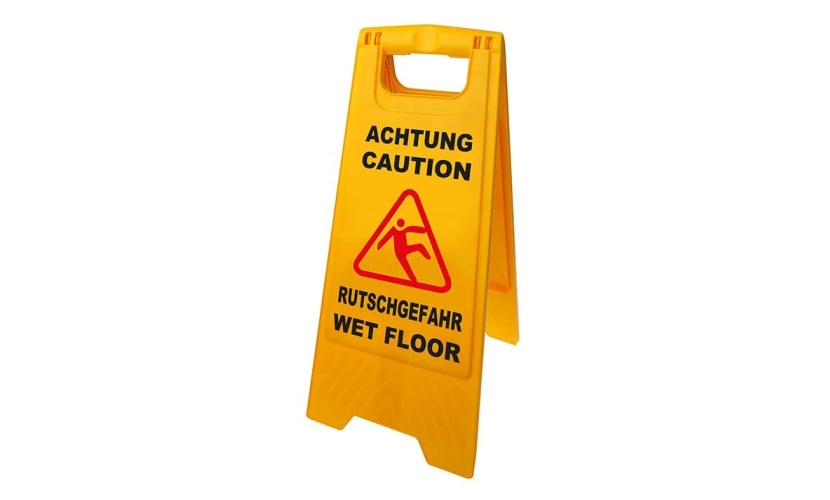 Πινακίδα "caution wet floor" για την προειδοποίηση ολισθηρού δαπέδου.