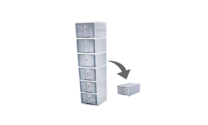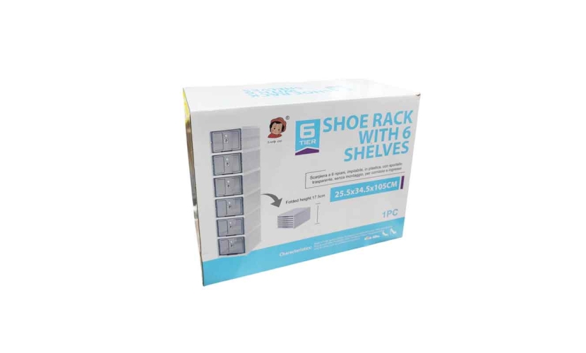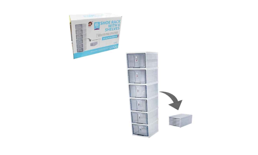Πρακτική ραφιέρα παπουτσιών με 6 ξεχωριστές θέσεις/κουτιά, ιδανική για οργάνωση και αποθήκευση παπουτσιών στο σπίτι ή το γραφείο. Κατασκευασμένη από ανθεκτικό πλαστικό, με διάφανες πόρτες που ανοίγουν εύκολα για άμεση πρόσβαση. Τοποθετείται κάθετα για εξοικονόμηση χώρου και μπορεί να αποσυναρμολογηθεί για εύκολη αποθήκευση.