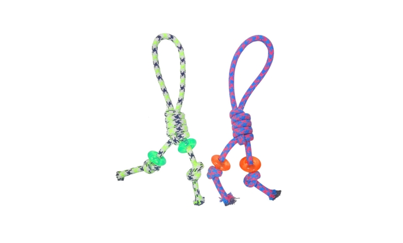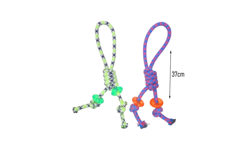 Το παιχνίδι σκύλου από σχοινί με κόμπους και πλαστικά δαχτυλίδια είναι ιδανικό για διασκέδαση, εκτόνωση και εκπαίδευση του κατοικίδιου. Κατασκευασμένο από ανθεκτικό υλικό σχοινιού, προσφέρει ασφαλές δάγκωμα ενώ συμβάλλει στον καθαρισμό των δοντιών και την ενδυνάμωση των ούλων.