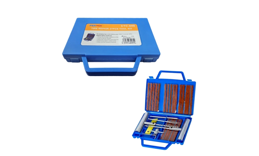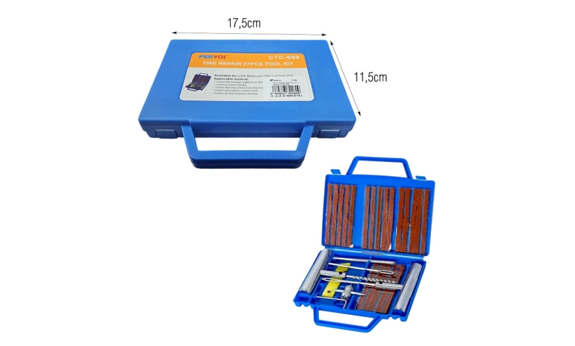 Πρακτικό και πλήρες σετ επισκευής ελαστικών 27 τεμαχίων, ιδανικό για χρήση σε αυτοκίνητα, μοτοσυκλέτες, βαν, τροχόσπιτα και ATV. Περιλαμβάνει όλα τα απαραίτητα εργαλεία και αυτοκόλλητα βουλώματα για άμεση και αποτελεσματική επιδιόρθωση τρυπών στο ελαστικό, χωρίς να απαιτείται αποσυναρμολόγηση.