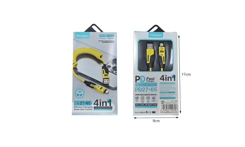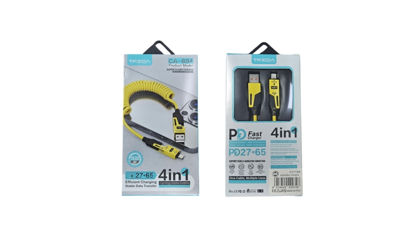Το Treqa CA-894 είναι ένα έξυπνο και πρακτικό 4 σε 1 καλώδιο δεδομένων με ελατηριωτό σχεδιασμό, ιδανικό για όσους χρειάζονται πολλαπλές επιλογές φόρτισης σε μία λύση. Υποστηρίζει Super Flash Charge για γρήγορη και αποτελεσματική φόρτιση, ενώ εξασφαλίζει σταθερή μεταφορά δεδομένων χωρίς διακοπές. Με μήκος 1500mm, είναι ιδανικό για χρήση στο σπίτι, το γραφείο ή το αυτοκίνητο.