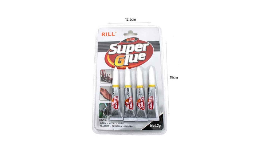 Ισχυρή κόλλα στιγμής RILL Super Glue σε πρακτική συσκευασία με 4 σωληνάρια των 3g. Κατάλληλη για γρήγορη και ανθεκτική συγκόλληση σε διάφορες επιφάνειες όπως μέταλλο, γυαλί, πλαστικό, καουτσούκ, κεραμικό και ξύλο. Ιδανική για επισκευές στο σπίτι, χειροτεχνίες και κατασκευές.Χαρακτηριστικά: