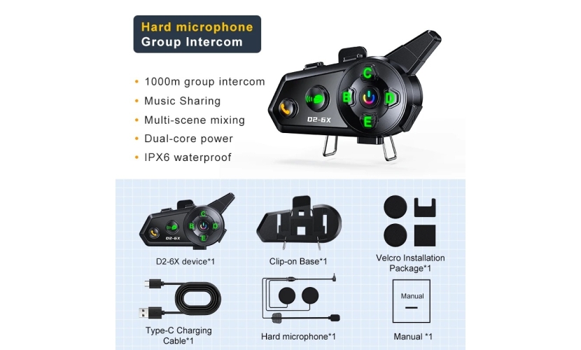 Ασύρματη Ενδοεπικοινωνία Μοτοσικλέτας 1000mAh D2-6X - Wireless Helmet Headset - Τεχνολογία Bluetooth 5.0+5.3: Απολαύστε την απρόσκοπτη επικοινωνία με την τεχνολογία D2-6X Bluetooth 5.0+5.3, εξασφαλίζοντας καθαρές και σταθερές συνδέσεις έως και 1000 μέτρα. - Εύρος επικοινωνίας 1000m: Μην χάσετε ποτέ ξανά την επαφή! Με μια εντυπωσιακή εμβέλεια επικοινωνίας 1000 μέτρων, αυτή η ενδοεπικοινωνία σας εξασφαλίζει ότι θα παραμένετε συνδεδεμένοι ακόμα και σε πολυσύχναστες ομάδες ιππασίας. συνδέονται ακόμη και σε πολυσύχναστες ομάδες ιππασίας. - Αδιάβροχη σχεδίαση: Δεν χρειάζεται να ανησυχείτε για κακές καιρικές συνθήκες, η D2-6X έχει σχεδιαστεί για να είναι αδιάβροχη, καθιστώντας την ιδανική για χρήση όλο το χρόνο. - Τοποθέτηση διπλού βραχίονα: Ο προστιθέμενος νάρθηκας παρέχει επιπλέον προστασία, διασφαλίζοντας ότι η ενδοεπικοινωνία σας διαρκεί περισσότερο και αντέχει σε πιο αυστηρές συνθήκες οδήγησης. -Κοινή χρήση μουσικής: Αυτό το ακουστικό σάς επιτρέπει να μοιράζεστε μουσική μεταξύ δύο ακουστικών, κάνοντας το ταξίδι πιο διασκεδαστικό. - Χωρητικότητα 6 αναβατών: Αυτή η ενδοεπικοινωνία έχει σχεδιαστεί για να φιλοξενεί έως και 6 αναβάτες, καθιστώντας την ιδανική επιλογή για μεγάλες ομάδες ή κλαμπ ιππασίας. - Συμβατότητα με ακουστικά κράνους: Σχεδιασμένο για να ταιριάζει στα περισσότερα κράνη, το D2-6X είναι μια ευέλικτη επιλογή για κάθε αναβάτη μοτοσικλέτας.