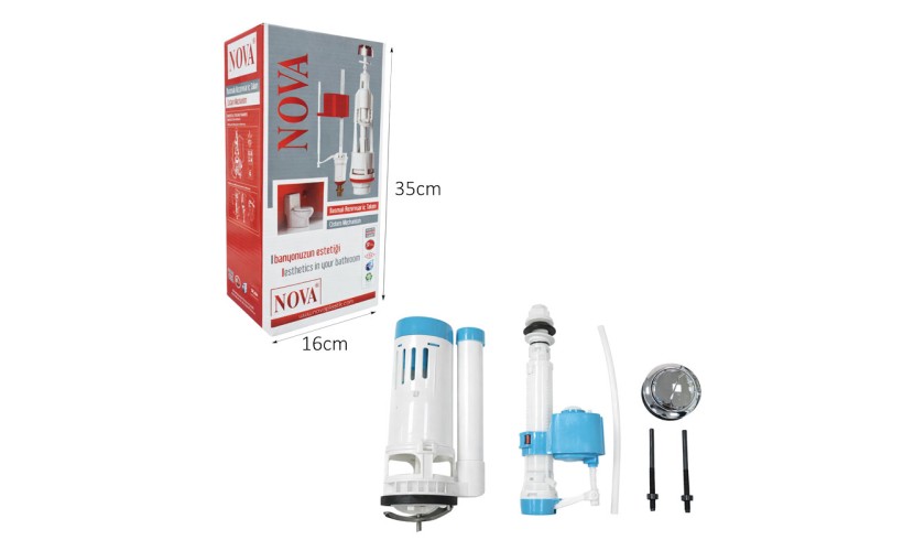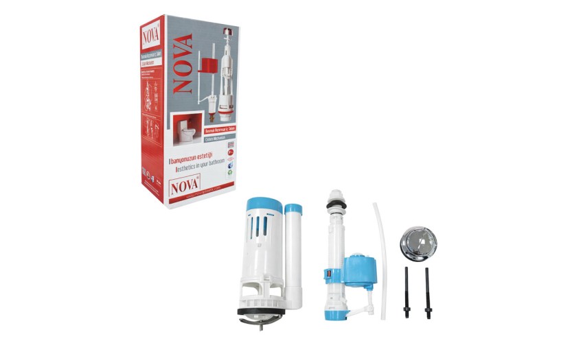 Πλήρες σετ μηχανισμού καζανακίου NOVA, ιδανικό για αντικατάσταση ή αναβάθμιση υπάρχοντος συστήματος. Το σετ περιλαμβάνει μηχανισμό εκκένωσης, φλοτέρ πλήρωσης, σωληνάκι σύνδεσης, μπουτόν διπλής ροής και εξαρτήματα στερέωσης, προσφέροντας ολοκληρωμένη λύση για άμεση και εύκολη εγκατάσταση. Η διπλή επιλογή ροής συμβάλλει στην εξοικονόμηση νερού και στη βελτιστοποίηση της κατανάλωσης.