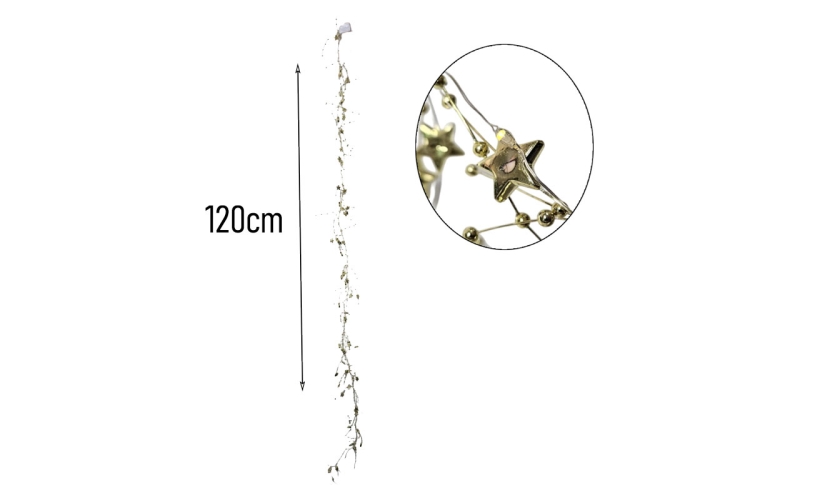 Εντυπωσιακή χριστουγεννιάτικη φωτιζόμενη γιρλάντα με χρυσά αστέρια και πέρλες. Διαθέτει ενσωματωμένα λαμπάκια που δημιουργούν μια ζεστή, γιορτινή ατμόσφαιρα και χαρίζουν λάμψη σε κάθε σημείο του σπιτιού. Ιδανική για στολισμό δέντρου, τζακιού, τραπεζιού ή καθρέφτη.