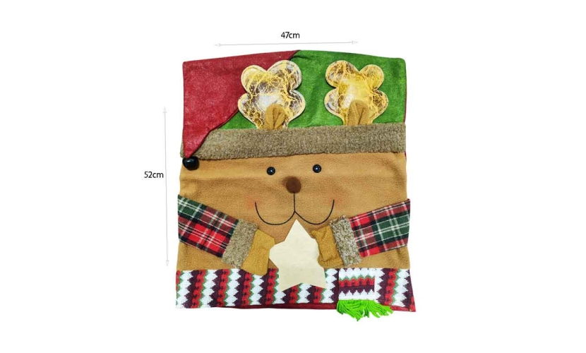 Υφασμάτινο κάλυμμα καρέκλας σε σχέδιο τάρανδο, με χαρούμενα χρώματα και εορταστικές λεπτομέρειες. Ιδανικό για να διακοσμήσετε την τραπεζαρία σας τις γιορτές και να δημιουργήσετε ζεστή, χριστουγεννιάτικη ατμόσφαιρα. Διαστάσεις: 47x52cm.