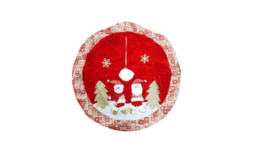 Υφασμάτινη χριστουγεννιάτικη ποδιά για το δέντρο, σε έντονο κόκκινο χρώμα με διακόσμηση Άγιο Βασίλη, δέντρα και χρυσές νιφάδες. Προσθέτει γιορτινή λάμψη και καλύπτει τη βάση του δέντρου με στυλ και κομψότητα. Διάμετρος: 95cm.