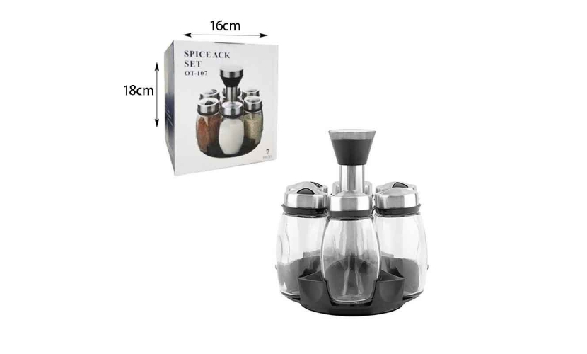 Οργανώστε τα αγαπημένα σας μπαχαρικά με στυλ και πρακτικότητα με αυτό το σετ 7 τεμαχίων OT-107. Περιλαμβάνει 6 γυάλινα δοχεία με ανοξείδωτα καπάκια και μία κομψή, περιστρεφόμενη βάση για εύκολη πρόσβαση. Ιδανικό για την κουζίνα σας, προσφέρει καθαρή αποθήκευση και εξοικονόμηση χώρου.
