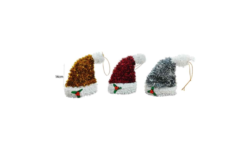 Χριστουγεννιάτικα καπελάκια σε κόκκινο, χρυσό και ασημί χρώμα, διακοσμημένα με λευκό γούνινο τελείωμα και μοτίβο γκι. Ιδανικά για να στολίσουν το δέντρο, το τζάκι ή το γιορτινό τραπέζι, προσθέτοντας μια λαμπερή πινελιά στις γιορτές. Ύψος 14cm.