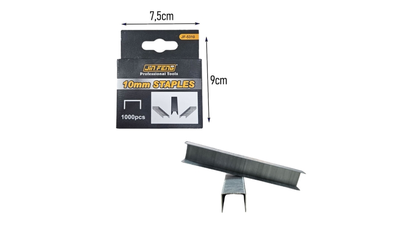 Τα συρραπτικά 10mm της Jin Feng είναι κατάλληλα για χρήση με χειροκίνητα ή πνευματικά καρφωτικά. Κατασκευασμένα από ανθεκτικό ατσάλι, προσφέρουν σταθερό και ασφαλές καρφίδωμα σε ξύλο, ύφασμα, δέρμα, χαρτόνι και άλλα υλικά. Ιδανικά για εργασίες επιπλοποιίας, ταπετσαρίας, χειροτεχνίας και γενικές επισκευές. Η συσκευασία περιλαμβάνει 1000 τεμάχια, εξασφαλίζοντας μεγάλη διάρκεια χρήσης και επαγγελματικό αποτέλεσμα.