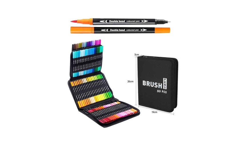 Επαγγελματικό σετ μαρκαδόρων brush 80 τεμαχίων με διπλή μύτη, ιδανικό για ζωγραφική, σκίτσο, lettering, manga, σχέδιο μόδας και καλλιτεχνικές δημιουργίες. Κάθε μαρκαδόρος διαθέτει δύο άκρες: μία λεπτή για λεπτομέρειες και γραμμές ακριβείας και μία brush για σκιάσεις, γεμίσματα και καλλιγραφία.