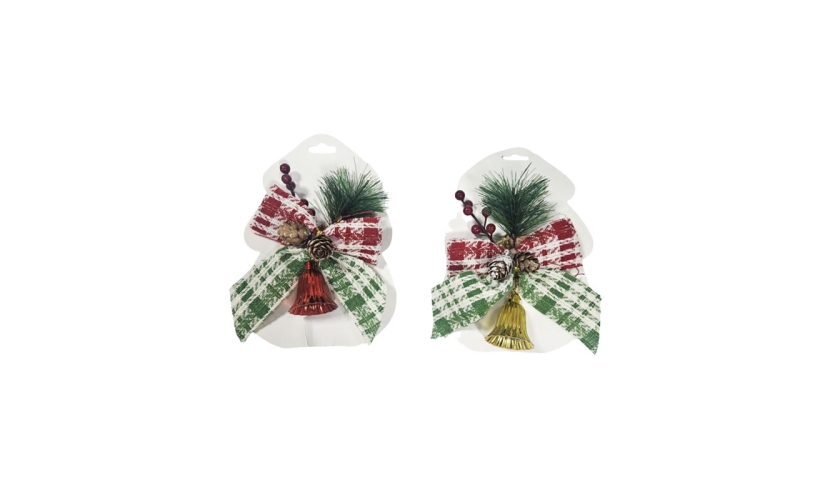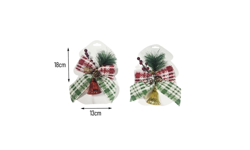 Χριστουγεννιάτικη διακοσμητική κορδέλα με κουδούνι, κουκουνάρι, κλαδάκι και μούρα, ιδανική για στολισμό πόρτας, δέντρου ή γιορτινής σύνθεσης. Κατασκευασμένη με προσοχή στη λεπτομέρεια, συνδυάζει υφασμάτινη κορδέλα σε παραδοσιακά χρώματα με κουδούνι για ζεστή και εορταστική ατμόσφαιρα.