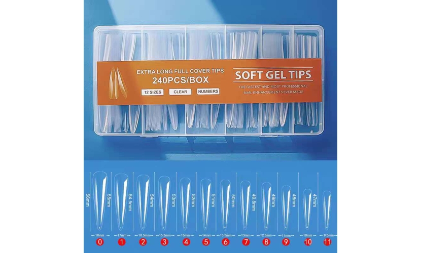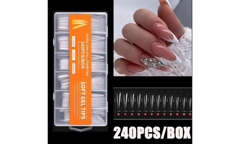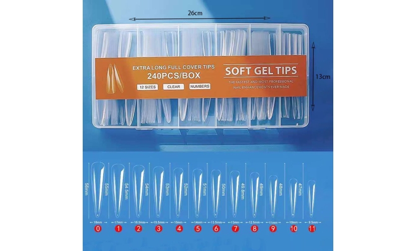 Κασετίνα μαλακά τεχνητά νύχια 12 μεγέθοι 240τμχ – Extra Long Full Cover Nail Tips Clear Soft Gel Tips 240pcs