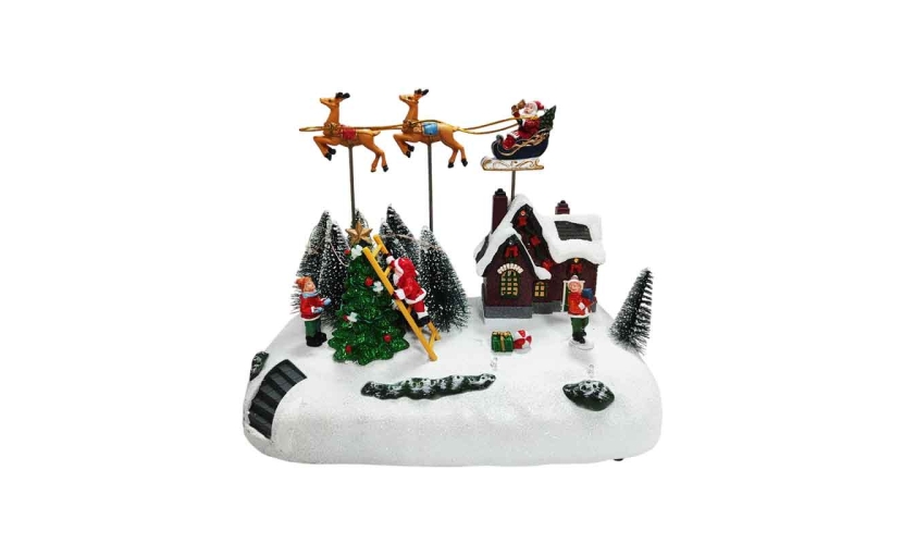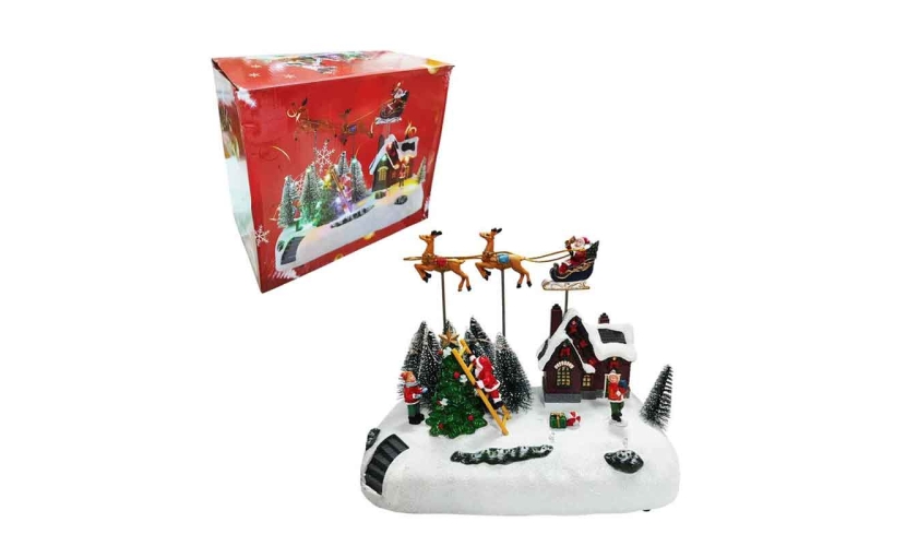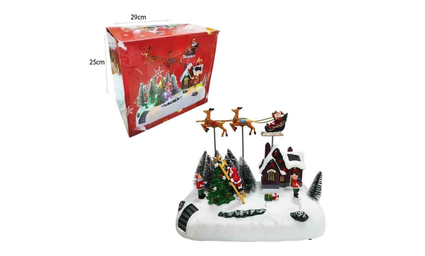 Εντυπωσιακό χριστουγεννιάτικο χωριό με φωτισμό LED και μουσική. Διαθέτει τον Άγιο Βασίλη με το έλκηθρο, ταράνδους και χιονισμένο τοπίο με σπιτάκια και δέντρα. Ιδανικό για διακόσμηση σαλονιού ή βιτρίνας, δημιουργεί μαγική γιορτινή ατμόσφαιρα. Διαστάσεις συσκευασίας: 29×25cm.