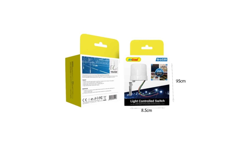 Διαστάσεις συσκευασίας: 8.5 × 9.5 cmΤάση: AC 220–240VΡεύμα: 25AΣυχνότητα: 50HzΈλεγχος φωτός: <5–100 LUXΚατάλληλο για εξωτερική χρήση
