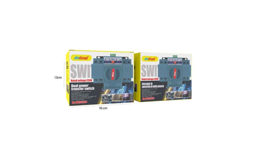 Διακόπτης μεταγωγής διπλής τροφοδοσίας, κατάλληλος για εναλλαγή μεταξύ δύο πηγών ρεύματος, όπως δίκτυο και γεννήτρια. Σχεδιασμένος για ασφαλή και αξιόπιστη λειτουργία σε οικιακές και επαγγελματικές ηλεκτρικές εγκαταστάσεις.