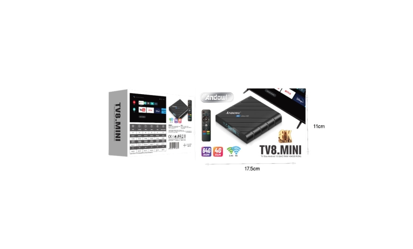 Το tv box της εταιρείας Andowl έχει μνήμη 4GB και μπορεί να αποδόσει περιεχόμενο ανάλυσης 8K UHD. Διαθέτει εσωτερικό αποθηκευτικό χώρο 64GB και το λειτουργικό του είναι Android 13.0. Με το λειτουργικό Android, το οποίο είναι το ίδιο με αυτό των κινητών τηλεφώνων, έχετε στη διάθεσή σας για εγκατάσταση όλες τις εφαρμογές που έχετε συνηθίσει να χρησιμοποιείτε στο τηλέφωνο ή στο τάμπλετ σας. Διαθέτει σύνδεσεις WiFi και 1x ethernet, οπότε μπορείτε να συνδεθείτε ασύρματα ή ενσύρματα στο τοπικό σας δίκτυο.