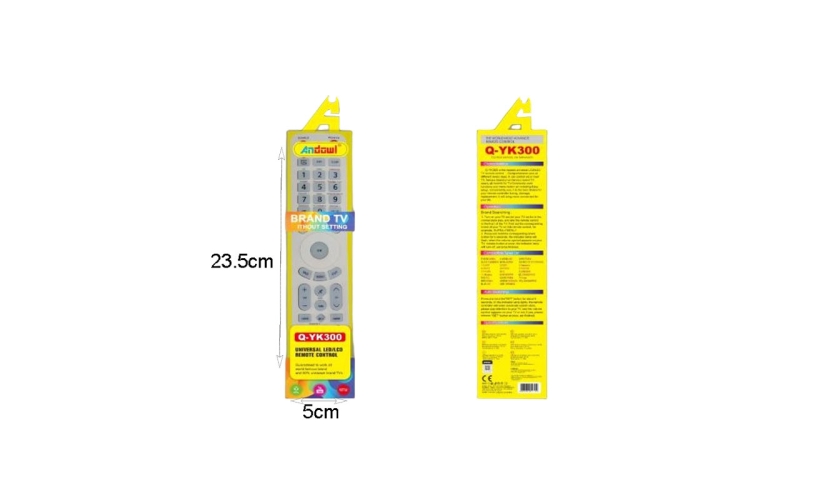 Το Q-YK300 είναι το νεότερο καθολικό τηλεχειριστήριο τηλεόρασης LCD/LED. Απαιτείται ολοκληρωμένη φροντίδα σε διαφορετικά επίπεδα, μπορεί να ελέγξει παλιά ή νέα τηλεόραση, διάσημη ή μη διάσημη τηλεόραση, σχεδόν όλα τα μοντέλα για τηλεόραση Λειτουργίες που χρησιμοποιούνται συνήθως και κουμπί μενού .Εύκολη εγκατάσταση, βολική χρήση, είναι η καλύτερη επιλογή για το τηλεχειριστήριο σας απώλεια, ζημιά, αντικατάσταση, θα φέρει πιο βολικό για τη ζωή σας.